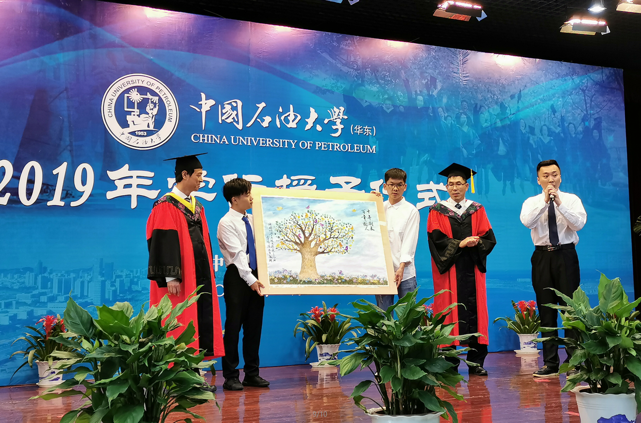 2015级本科生许旺、张岩代表全体毕业生为学院赠送礼物。“这幅名为’十年树木 百年树人’的画作由金沙js9线路中心2019届毕业生共同完成,画中的树干代表学校以及学院为我们提供的支持和平台;全体毕业生一起按下的指印作为树叶,寓意着我们在学院的支持下茁壮成长;树下铺满了勿忘我花草,象征我们永远会记得在母院学习和生活的日子,会记得老师们的谆谆教诲,会记得同学们之间的深厚情谊。也借这份礼物祝福母院十年树木,桃李满天下,百年树人,栋梁荣中华!”毕业生代表张岩说道。
