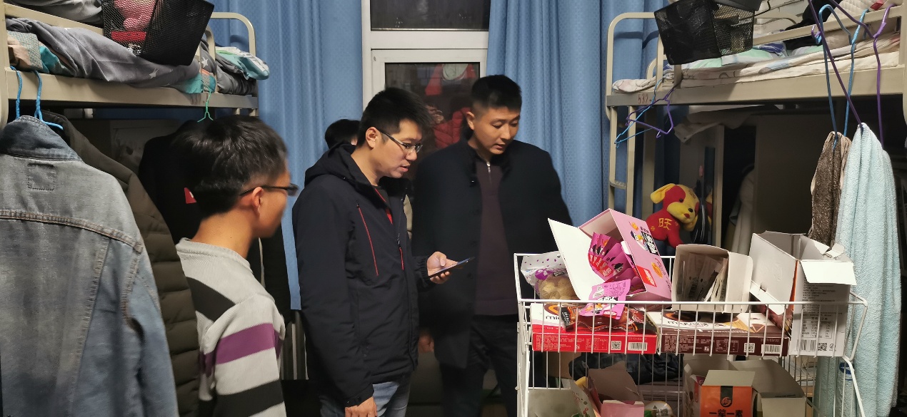 12月5日晚上,学院党委副书记徐永涛带领各年级辅导员进行学生公寓安全专项大检查,从金沙js9线路中心2016级本科生所在的18号公寓开始,此次检查特别邀请了学校公安处消防科科长石鹏飞进行指导,深入学生宿舍一线,对安全状况进行全方位、无死角、地毯式检查,对于存在的安全隐患,采取“零容忍、严处理”的态度。