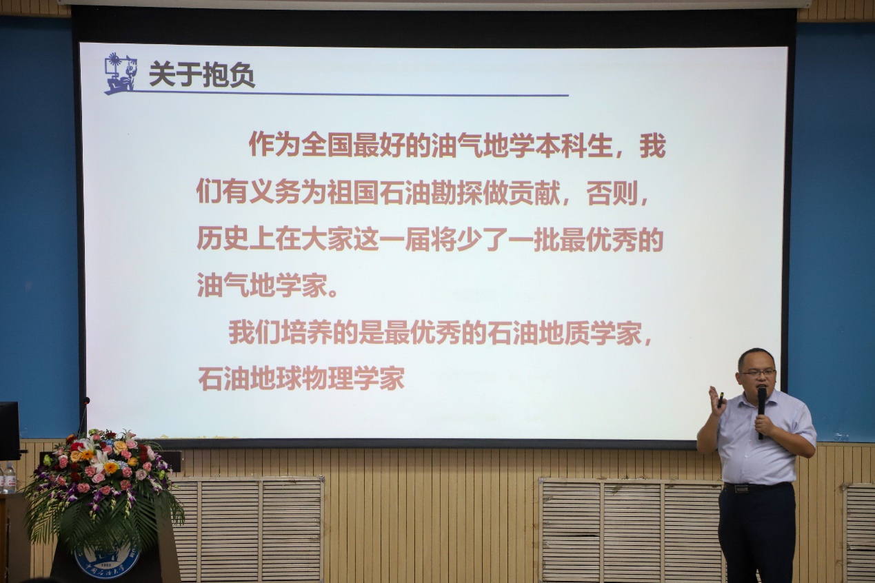 宗兆云从学校办学历程、学院一流学科建设、师资队伍建设、学科学位专业、科学技术研究等多个方面,向学生介绍学校、学院发展情况与人才培养实力。他表示,学院致力于培养最优秀的石油地质学家和石油地球物理学家,2021级新同学作为全国最好的油气地学本科生,有责任和义务为祖国石油勘探事业做出贡献。宗兆云结合自身在金沙js9线路中心(华东)从本科生到博士研究生的成长经历,展示了中国青年五四奖章获得者秦宁、山东省高校先进班集体勘查2016级2班等优秀事迹,勉励现场学生树立远大理想、涵养高尚情操,以学习为中心,做一名负责任、有担当,有抱负、有修为的合格大学生。宗兆云强调,油气资源是保障国家能源安全的战略性资源,未来30年,油气仍是经济社会发展主要依赖的能源。当前国家正加大油气资源勘探开发力度,他希望同学们在大学期间能够脚踏实地,善于思考实践,提出科学问题,解决实际难题。