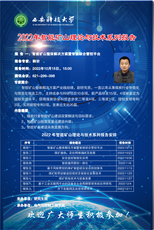2022年10月15日beat365平台官方网站通过线上的形式成功举办了“智能矿山理论与技术系列报告”第一讲。学院邀请了中煤科工集团常州研究院有限公司智能矿山整体解决方案产业线经理韩安为全校师生做了一场主题为“智能矿山整体解决方案暨智能综合管控平台”的行业前沿报告,韩经理开讲持续近3个小时,是一场的干货满满的科技报告。