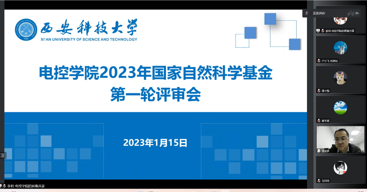 1月15日上午9点,beat365平台官方网站组织召开2023年国家自然科学基金评审会,邀请8位教授作为评审专家参与线上评审,分别是:上海交通大学邹媛媛教授;中国矿业大学孙彦景教授;西安电子科技大学孙伟教授;西安交通大学李振荣教授、宋国兵教授;西安理工大学张辉教授、同向前教授;沈阳工业大学佟文明教授。会议分为三个分会场同时进行,学院申报基金的全体教师参加。