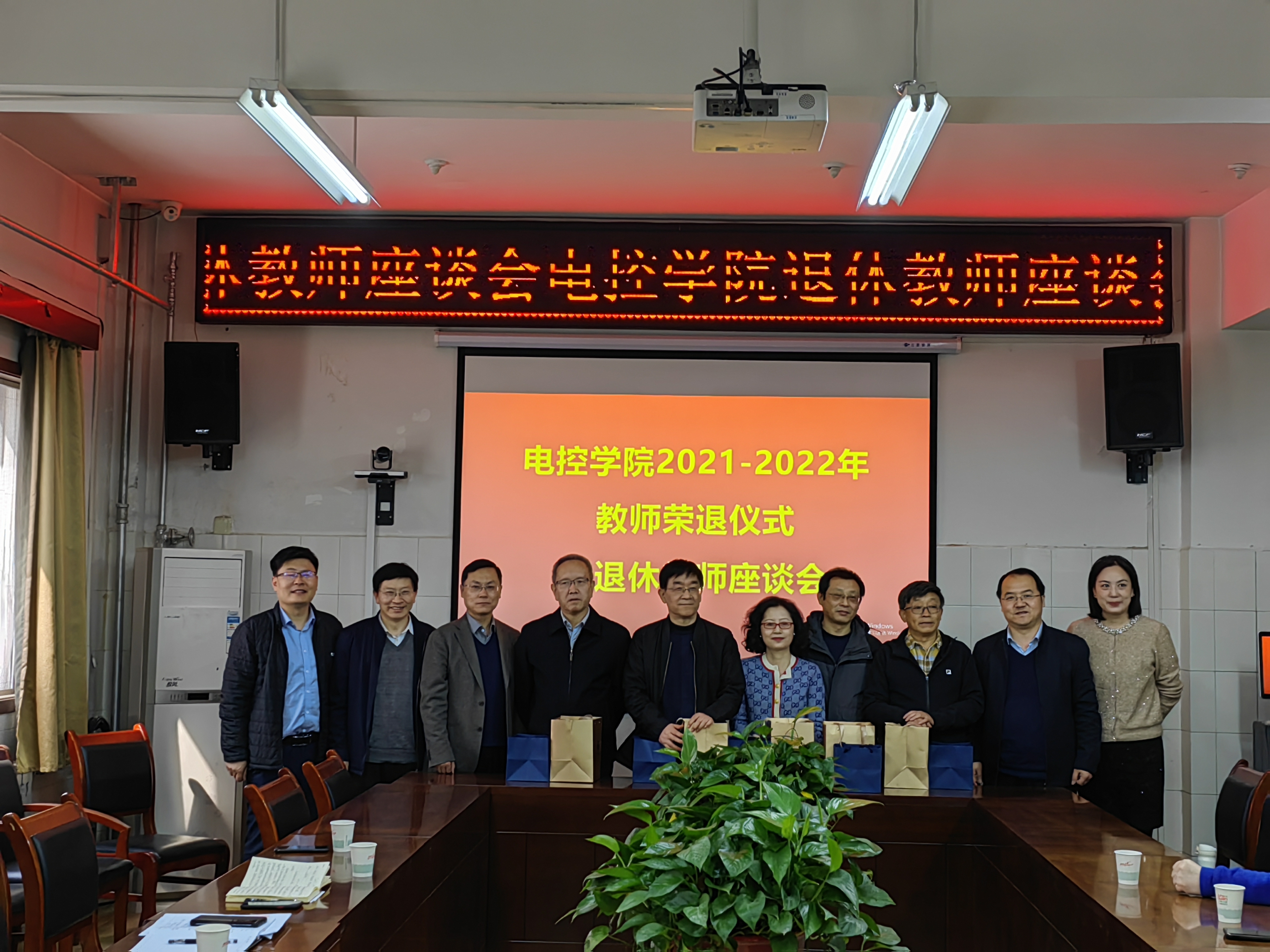 党委书记杨华、院长寇发荣、工会主席李红岩分别为2021~2022年退休的五位教师柴钰、鲁晓珲、王再英、童军、黄向东,送上祝福和纪念品,并合影留念。