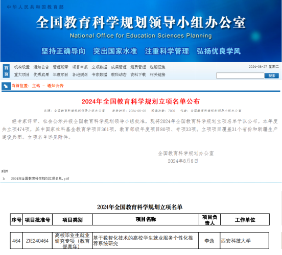 近日,全国教育科学规划领导小组办公室正式发布2024年全国教育科学规划立项名单,beat365平台官方网站辅导员李逸获批2024年全国教育科学规划项目高校毕业生就业研究专项(教育部青年项目),资助金额5万元。