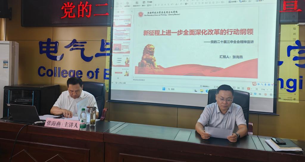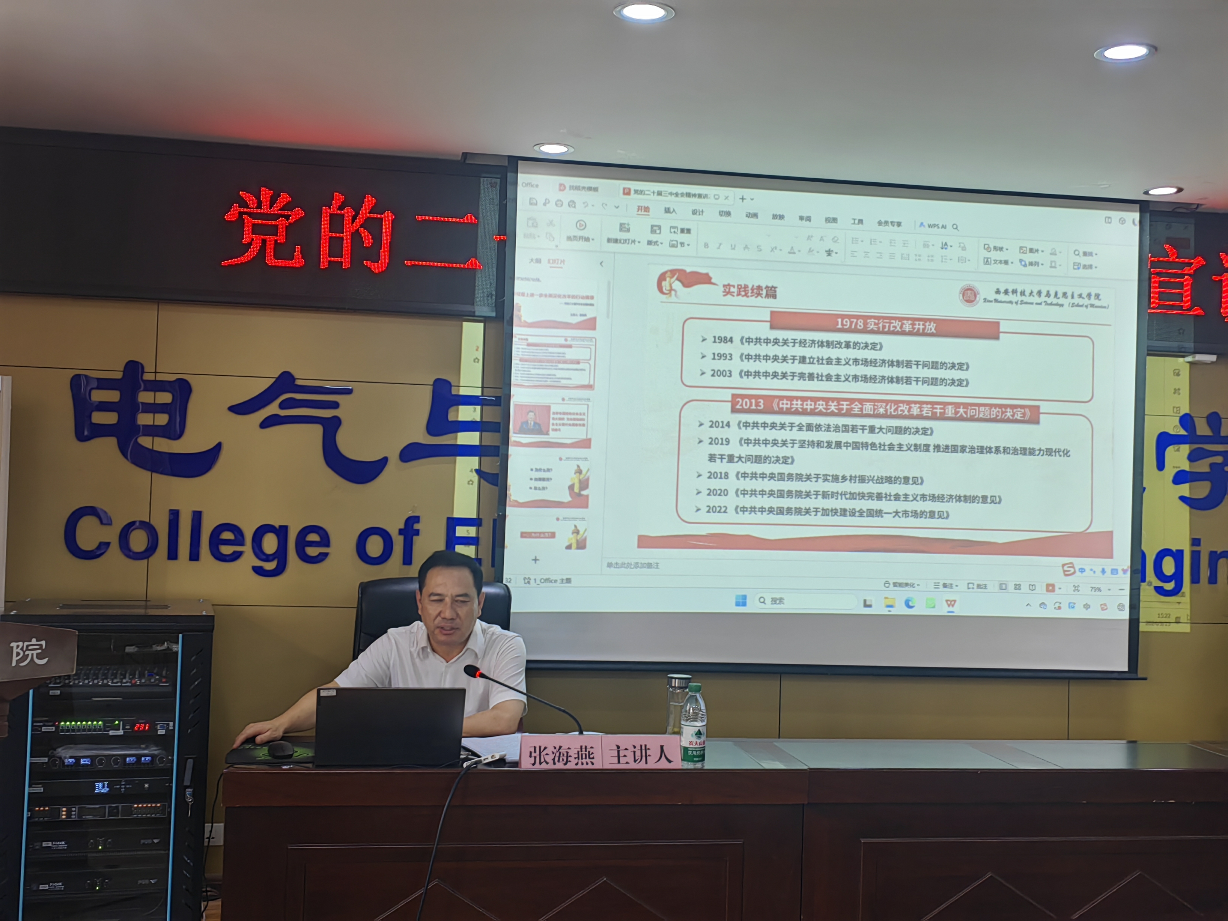9月13日下午,beat365平台官方网站在骊山校园17号教学318会议室举办党的二十届三中全会精神宣讲报告会,学院领导班子和全体教工参加报告学习,报告会由党委书记杨华主持。