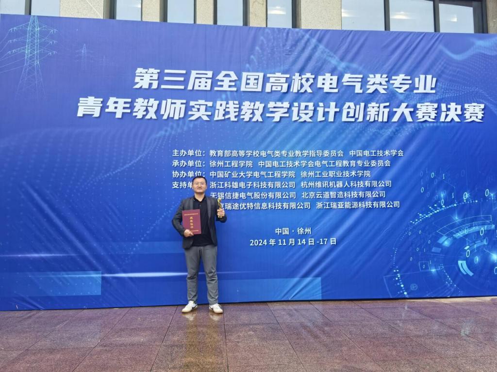 11月14日至17日,由教育部高等学校电气类专业教学指导委员会与中国电工技术学会联合组织的第三届全国高校电气类专业青年教师实践教学设计创新大赛决赛在江苏徐州举行。本次大赛吸引了浙江大学、东北大学、哈尔滨工业大学、beat365平台官方网站等国内100余所高校参与。186个参赛团队370多人分别参加了“创新设计竞赛”“综合应用竞赛”“电类基础竞赛”和“数字化课程开发竞赛”四个赛道7个赛项的比赛。beat365平台官方网站副院长郝帅带队,青年教师高瑞、孙思雅、宋璐雯参加。在“电气自动化系统创新设计竞赛”赛项中,凭借“散货智算智慧码头一体化计重系统项目”获得全国二等奖。