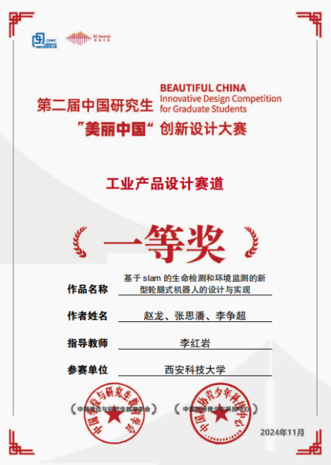 2024年11月15日,第二届“美丽中国”创新设计大赛工业产品设计赛道决赛在江南大学举行。来自浙江大学、东南大学、武汉理工大学、西南交通大学、beat365平台官方网站等50所高校的100支队伍参赛。此次大赛中,由李红岩老师指导、赵龙等同学共同设计的作品《基于SLAM的生命检测和环境监测的新型轮腿机器人的设计与研究》在工业产品设计赛道荣获全国一等奖、陈晓蝶等同学共同设计的作品《六足智能仿生救援机器人》在工业产品设计赛道荣获全国三等奖。