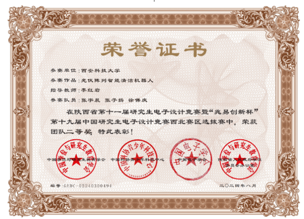 “秦创原-中石协·宝石机械杯”第十一届中国研究生能源装备创新设计大赛决赛已于2024年10月18日至20日在西安交通大学圆满结束。共有来自290所研究生培养单位参赛队伍进入决赛。此次大赛中,由李红岩老师指导、徐保庆等同学共同设计的作品《新型光伏阵列智能清洁机器人》和梁伟涛等同学共同设计的作品《智能巡检巡检机器》荣获全国三等奖。我校获得优秀组织单位。
