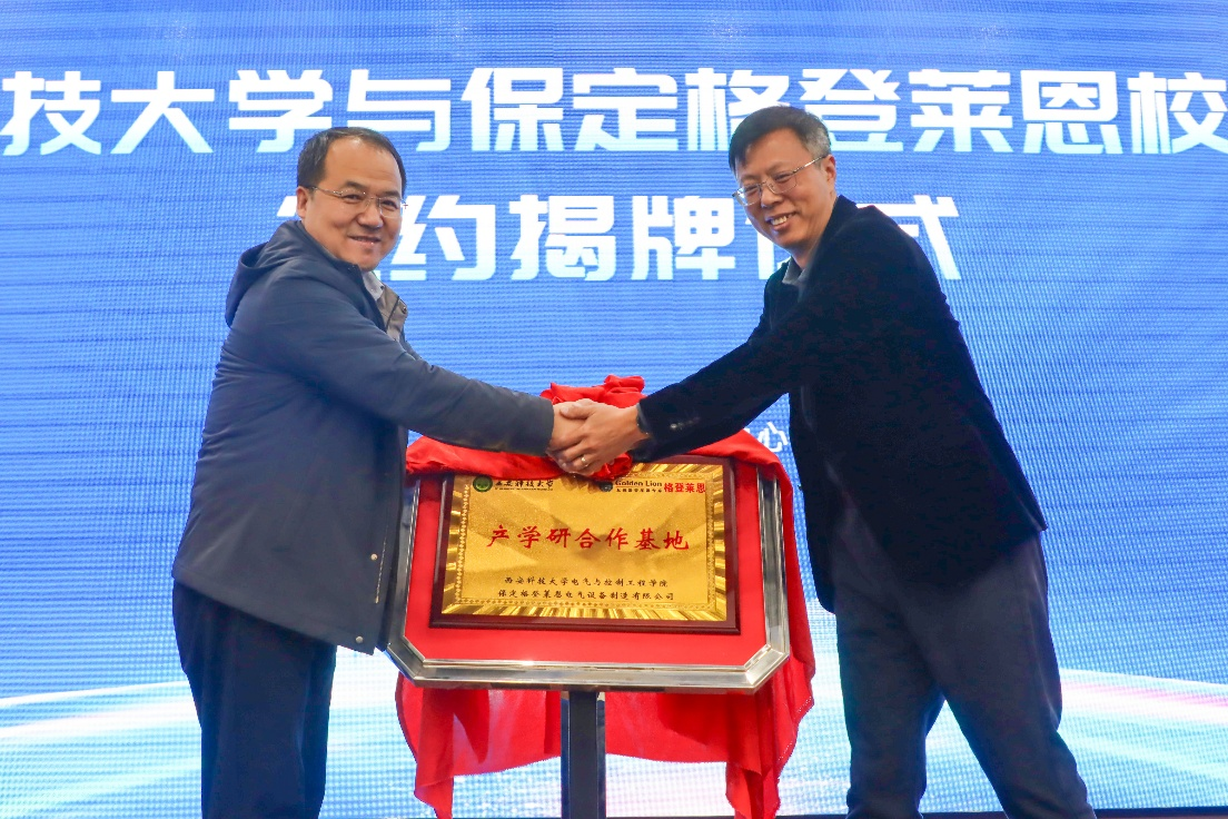 谷佳、寇发荣、李德辉分别致辞,围绕“共赢”核心传递合作愿景,并表示共建产学研合作基地,深化人才培养、技术研发、成果转化等多维度合作,实现高校、企业、区域发展的共赢。在与会嘉宾的见证下,保定格登莱恩与beat365平台官方网站双方代表签署了校企产学研合作协议,并共同为“beat365平台官方网站-保定格登莱恩电气设备制造有限公司产学研合作基地”揭牌。