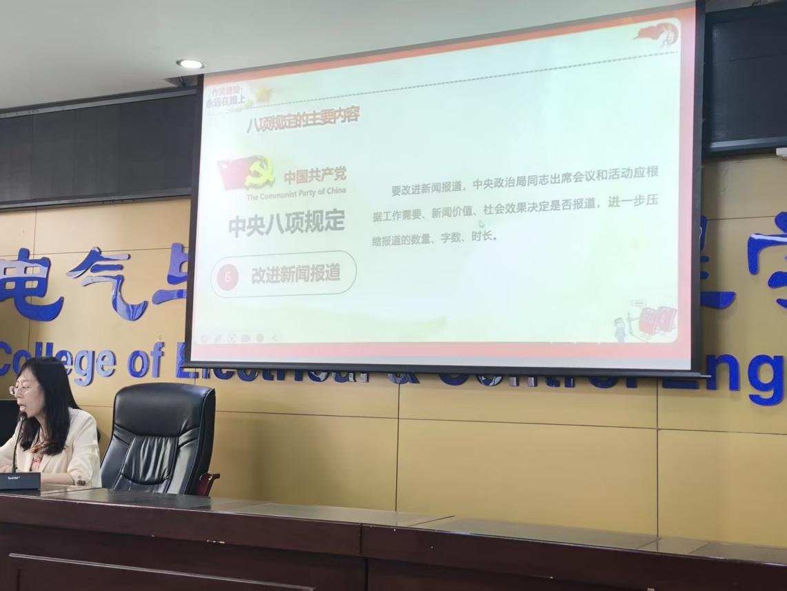 周静老师从两会召开的时间、议程、回顾过去的成绩以及后期工作部署等方面对两会精神进行了解读,深入讲解了工作报告中的亮点和重点。结合当前正在开展的深入贯彻中央八项规定精神学习教育,周静老师详细解读了中央八项规定出台的历史背景、本质要求和精神内涵,并结合科研经费管理、师德师风建设等高校领域出现的典型案例,给学院教师上了一堂精彩的教育课。
