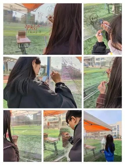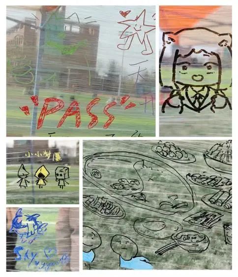 活动以“非语言表达+群体疗愈”为核心设计理念,创新性地采用保鲜膜作为创作载体,为学生提供了一个开放、自由的情绪表达空间。活动现场,工作人员提前铺设宽60厘米的保鲜膜,并配备了12色涂鸦笔,供参与者自由使用。同学们通过书写文字、绘制图案、涂抹色彩等方式,将内心的情绪、困惑与期望直观地呈现出来,形成了一幅充满创意与情感的“心理画卷”。在活动过程中,参与者不仅可以自由创作,还可以浏览他人作品,通过这种跨群体的互动形式,促进心灵共鸣与情感交流。许多同学表示,这种形式让他们能够暂时放下学业压力,以一种轻松的方式表达内心的真实感受,同时也能从他人的创作中获得启发与支持。活动期间,现场气氛活跃,欢声笑语不断。于飞老师在活动现场与同学们进行了深入交流,鼓励大家通过艺术表达释放情绪,并分享了一些心理健康的小技巧。心理部成员则全程协助,确保活动顺利进行,并为有需要的同学提供心理支持